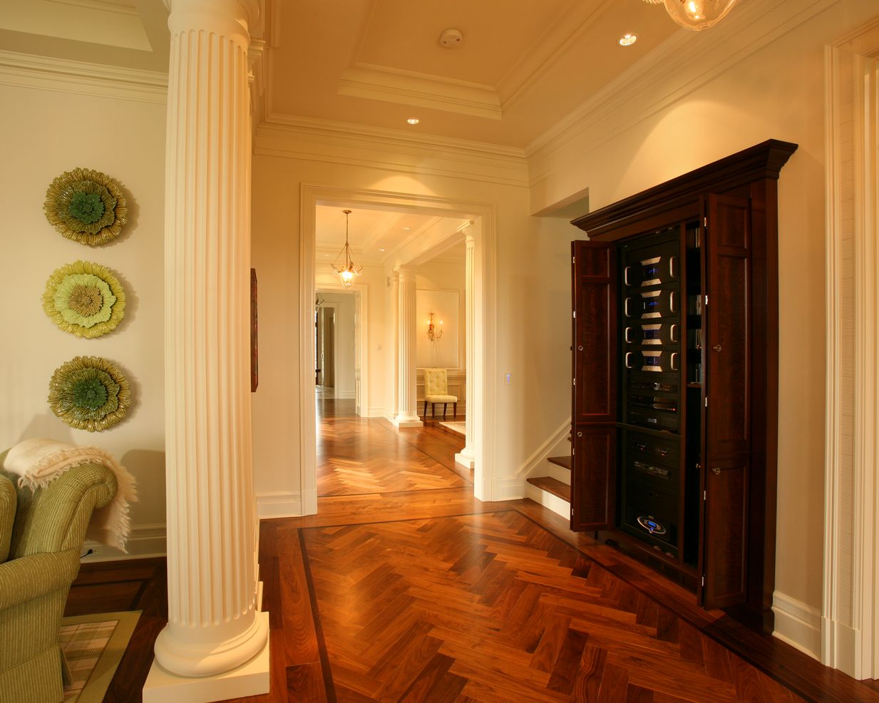 In the formal library a wireless controller sits out only when needed and the Elite plasma rises out of a custom built motorized lift enclosure. In the screening room, technology is hidden until the show begins, the screen is housed in the bulkhead and the projector resides in its own custom built, ventilated hush box. The Screening Room’s Equipment rack is housed inside a built in bar. The rack that holds the whole home equipment is in the main hallway, concealed within handcrafted wooden millwork.