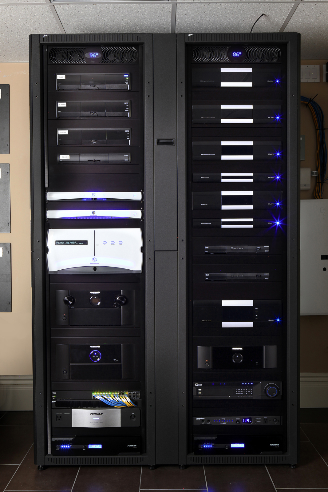 Equipment is housed in two large racks in a dedicated conditioned rack room as well as in structured panels (both network and Lutron enclosures) throughout the home’s 3 mechanical rooms.
